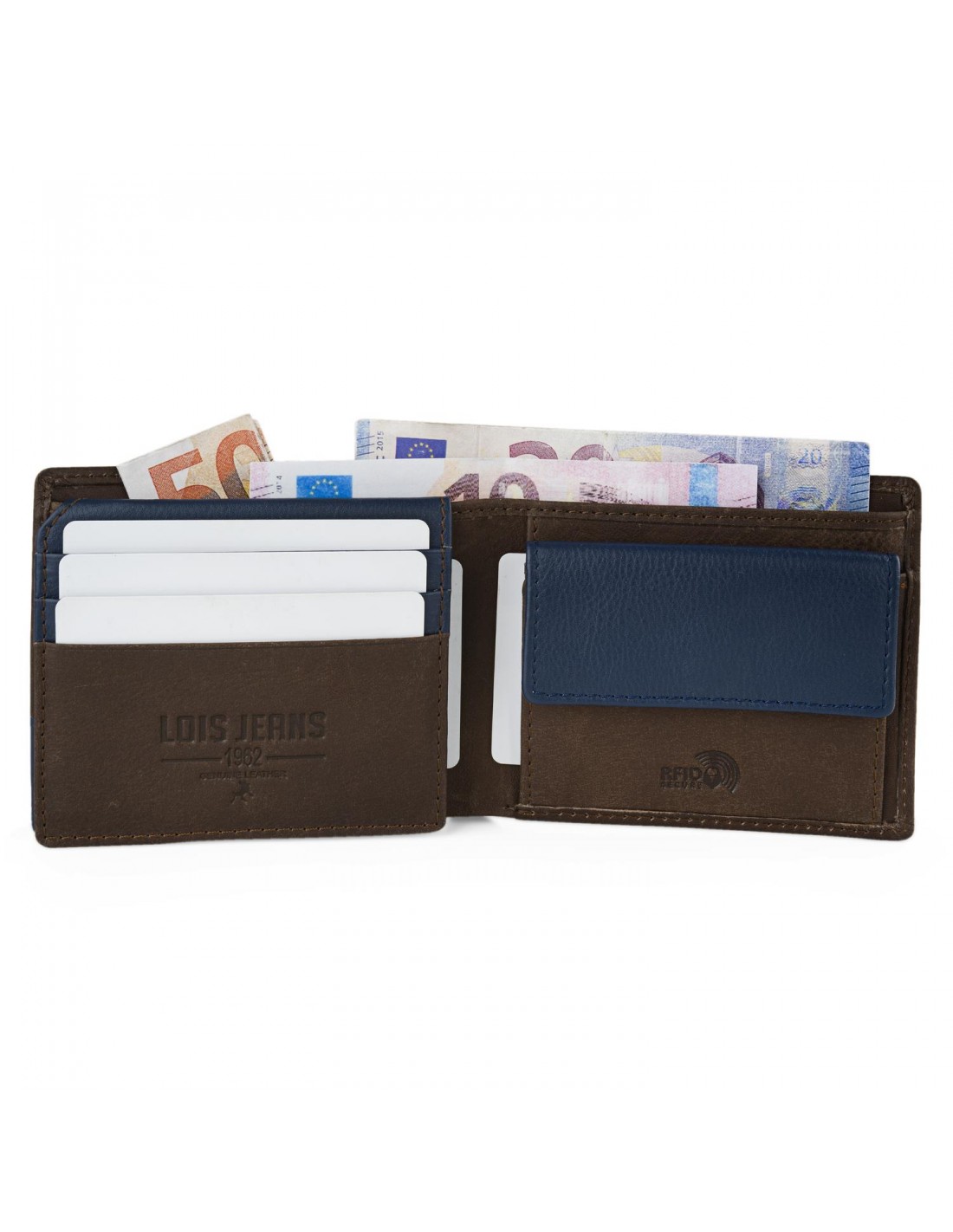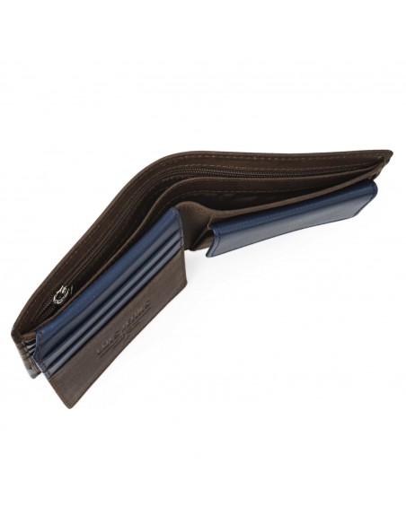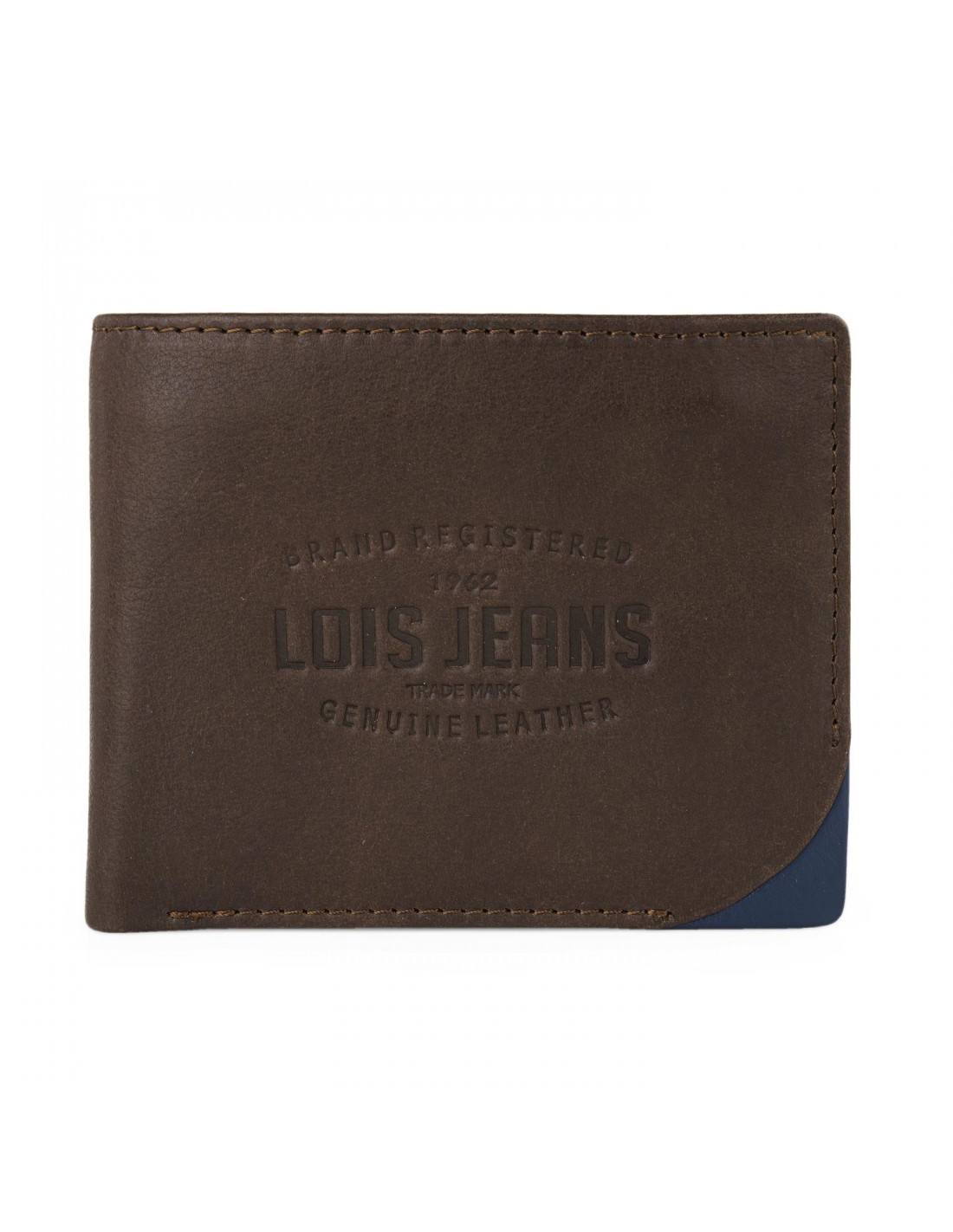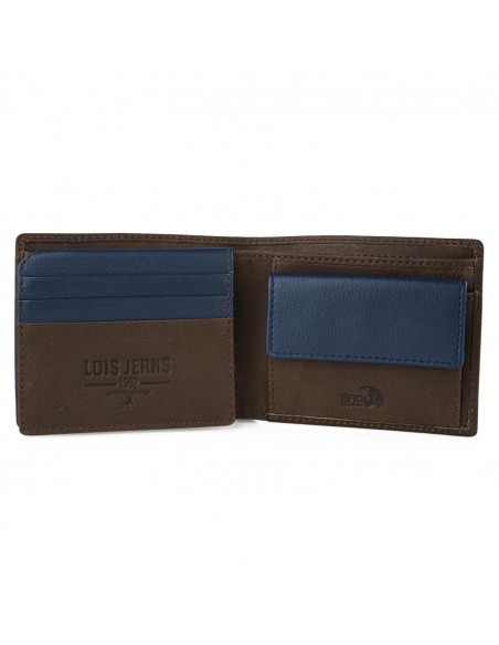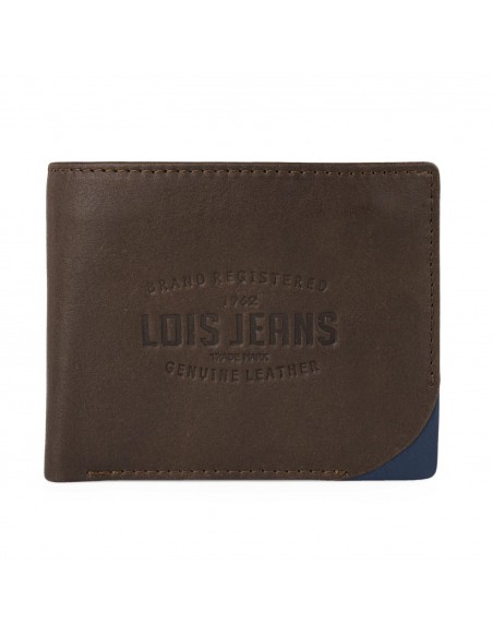 Confeccionada en piel genuina, la cartera de hombre Lois presenta un elegante diseño en color marrón con toques en azul marino y logo grabado en el frontal o su firma interior.