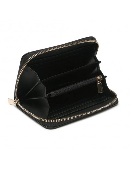 Diseño cerrado con cremallera por todo su contorno. Interior forrado con fuelle con separadores para tarjetas, billetes y monedas, y bolsillo con cremallera.