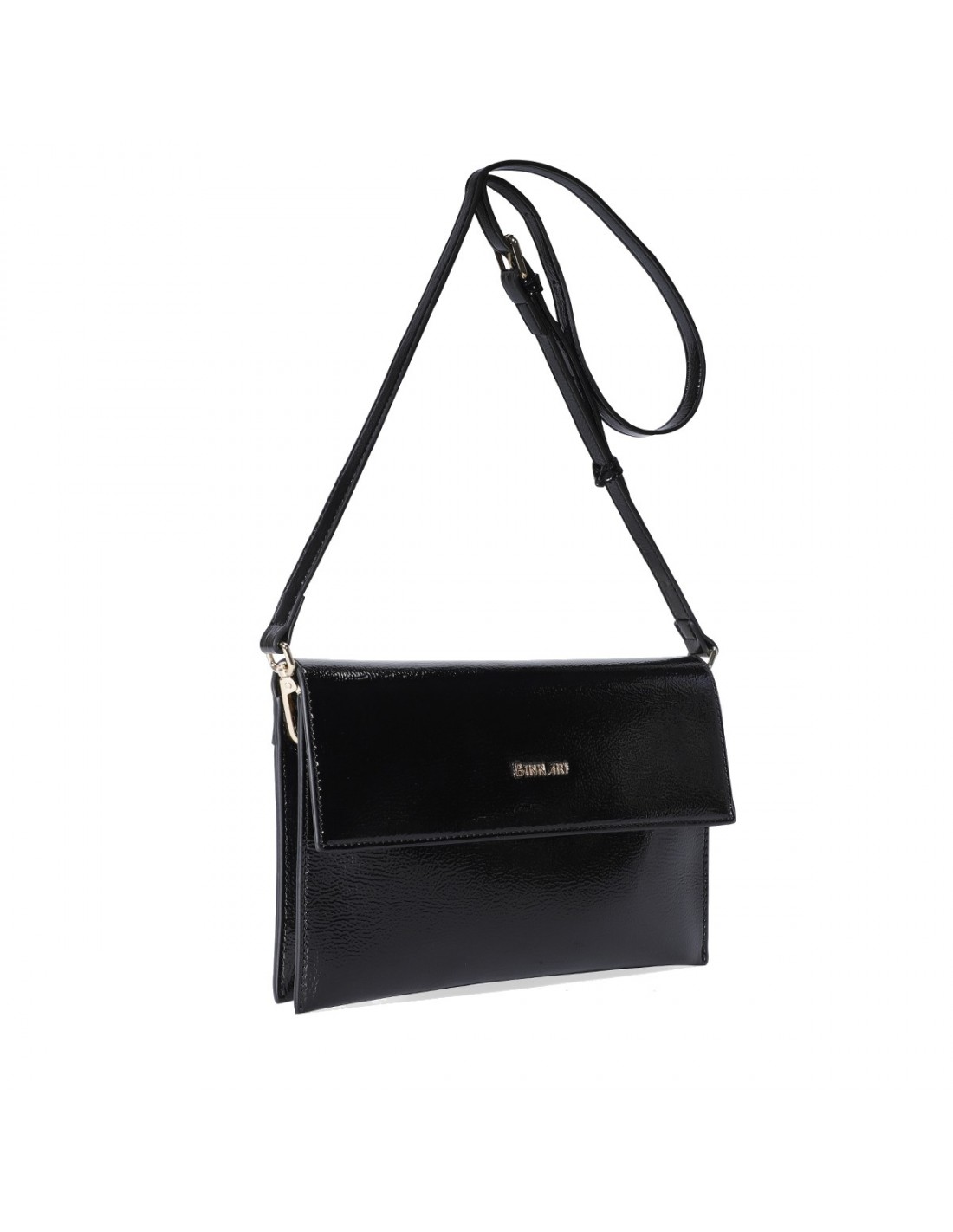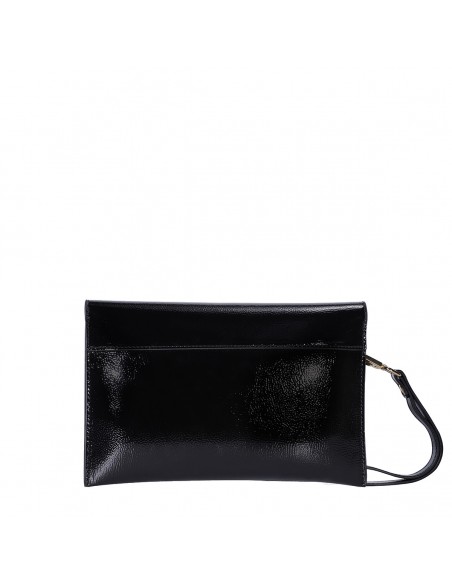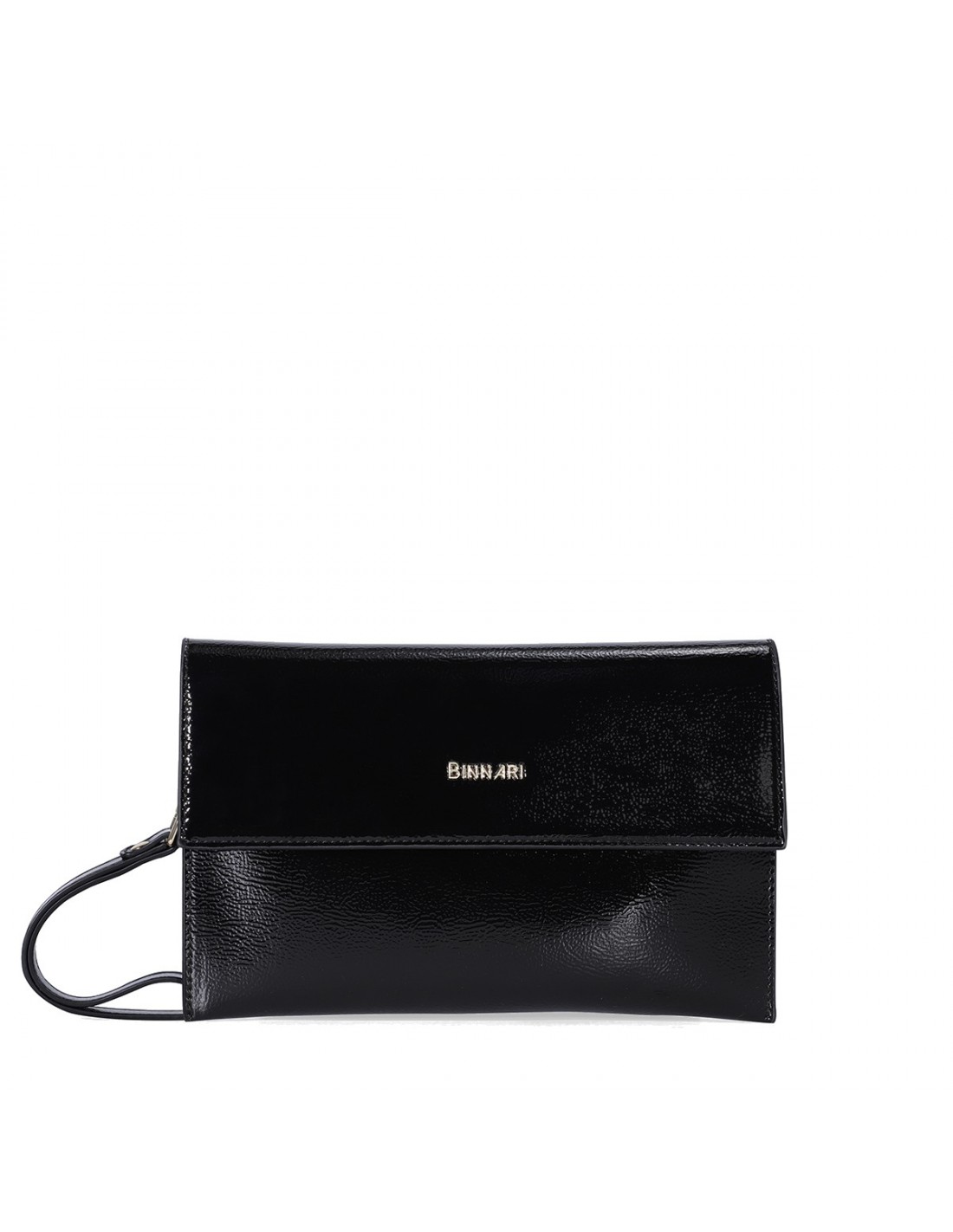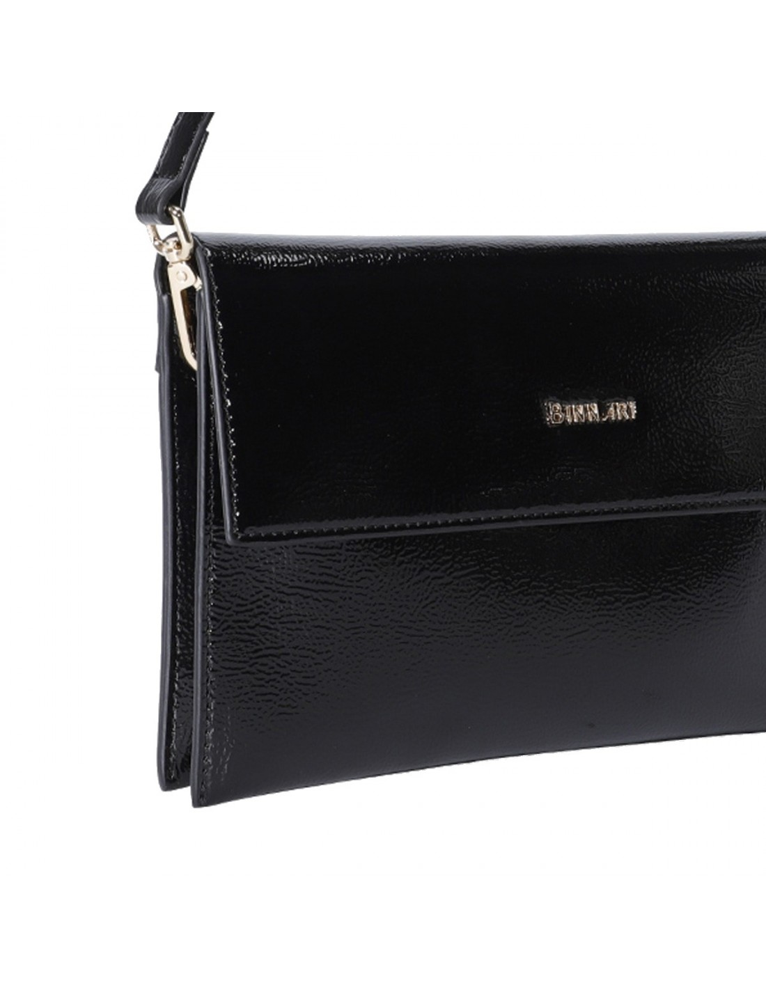 El bolso de Binnari Coimbra tipo sobre que presenta una bonita combinación de materiales, charol y pu metalizado, color negro con detalles metálicos en color oro claro.