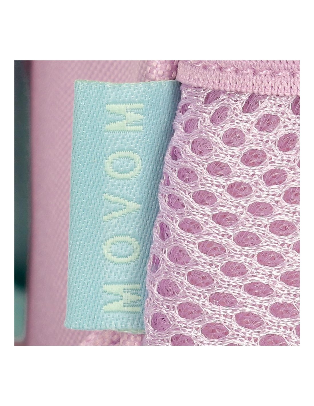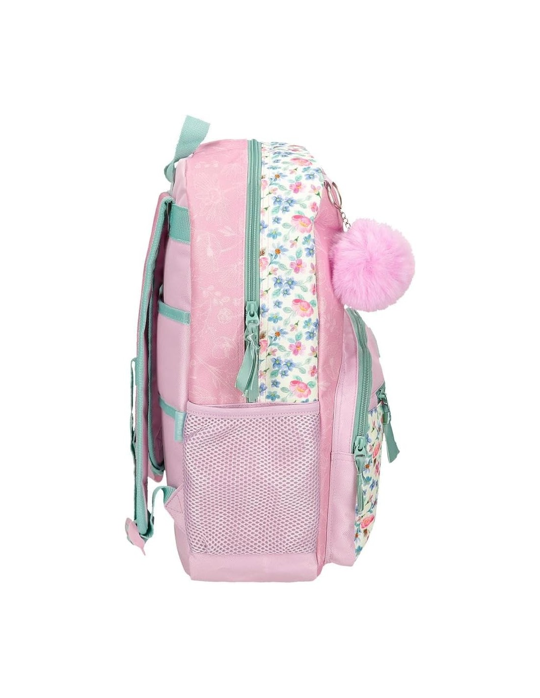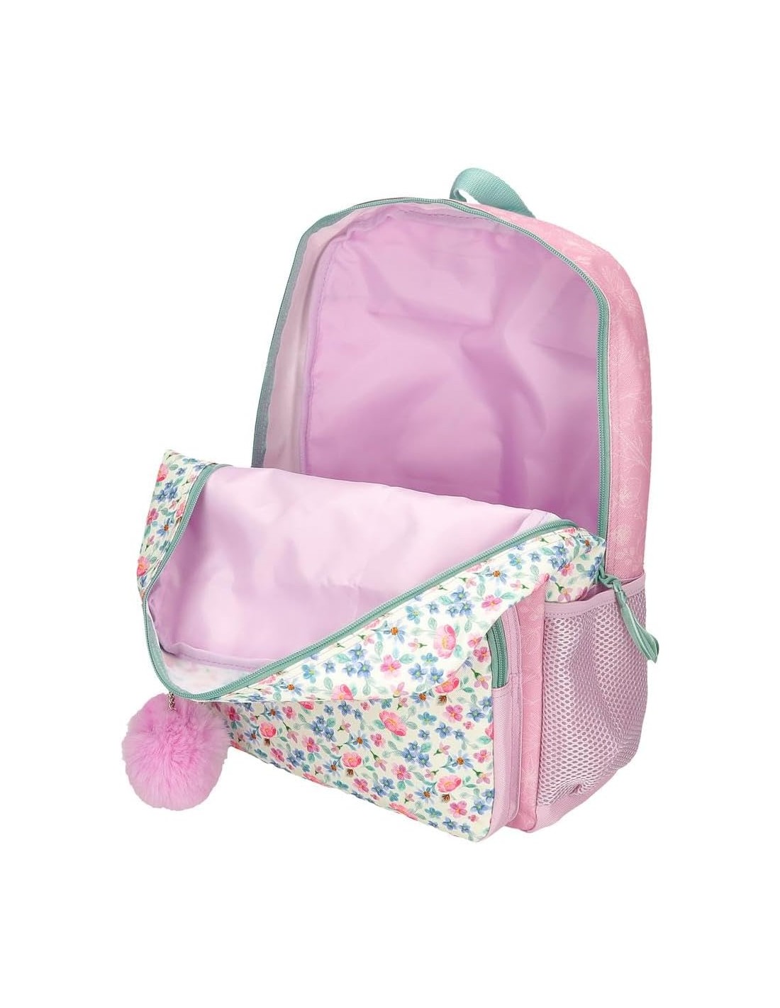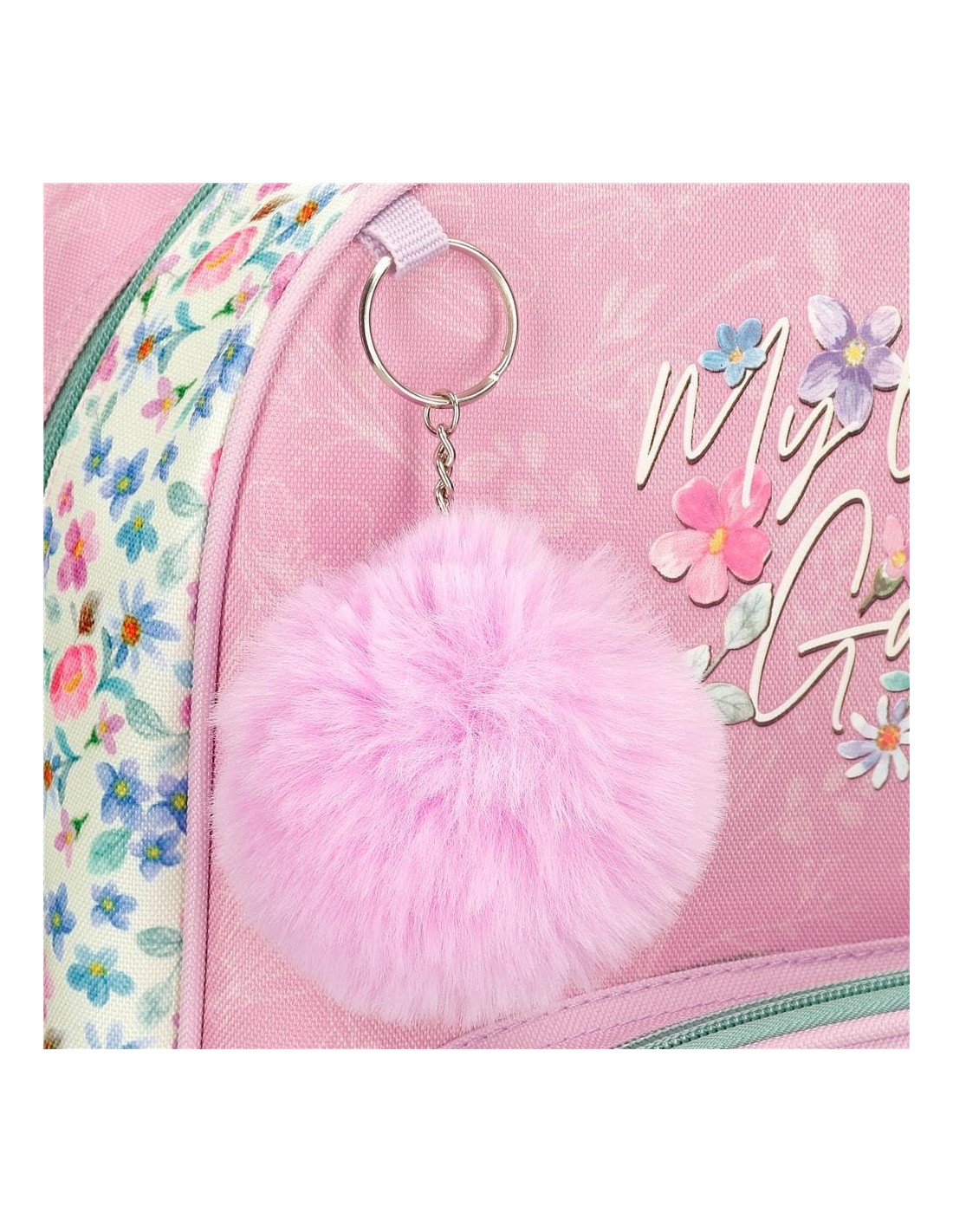 Fabricada en Poliéster, esta mochila destaca por su diseño único y colorido, con un llavero de pompón lila que le da un toque especial.