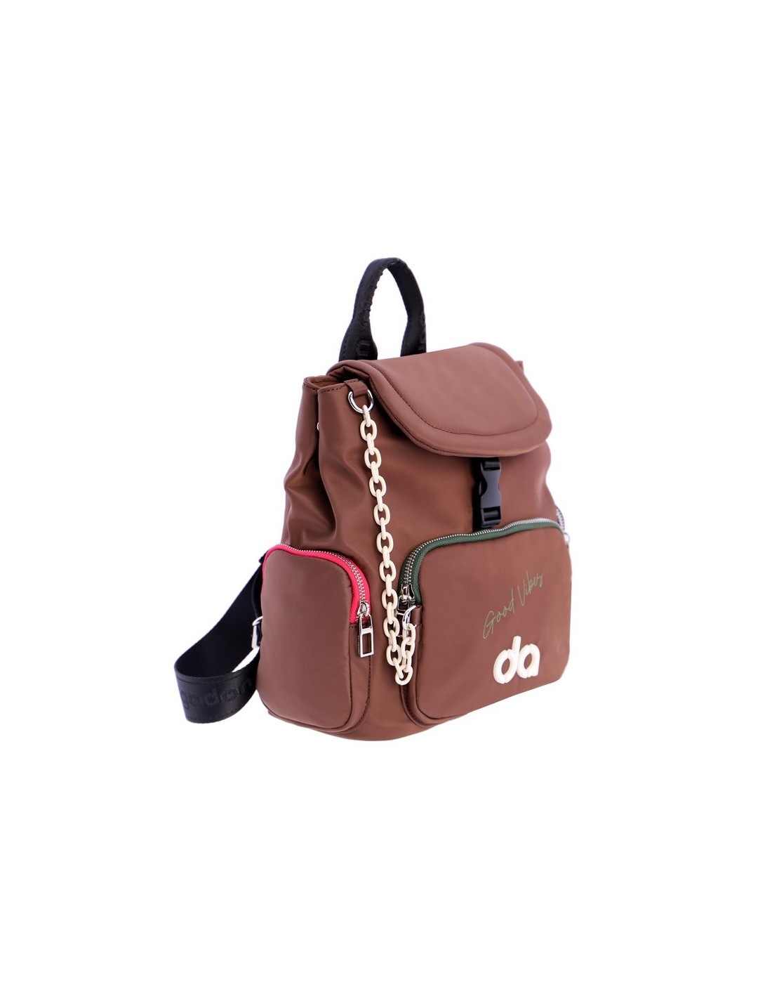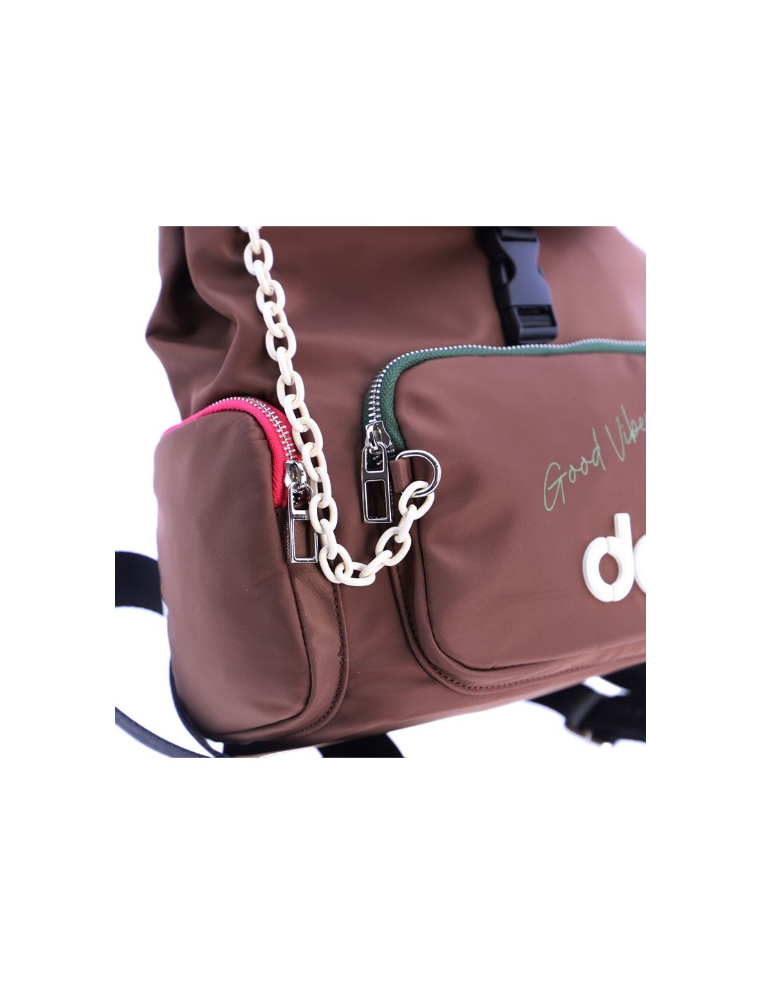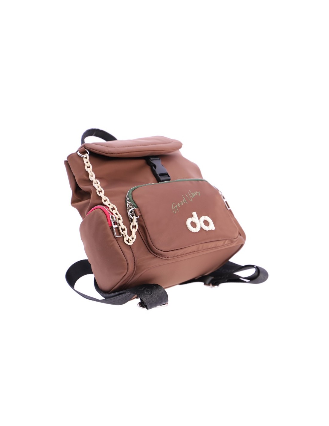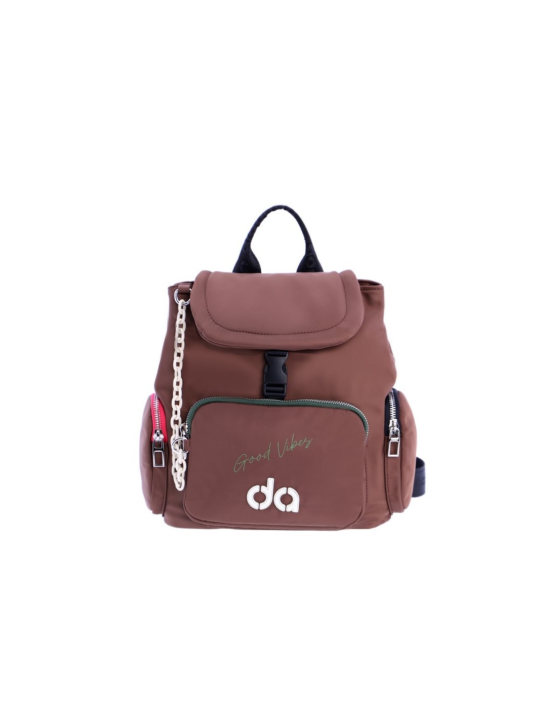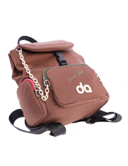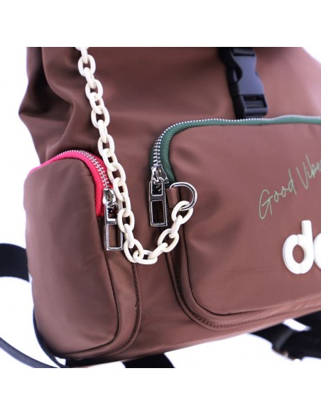 El material de nylon de la mochila para mujer Don Algodón Bolonia destaca por su durabilidad y resistencia, con el detalle especial de su logotipo en relieve y la frase "good vibes".