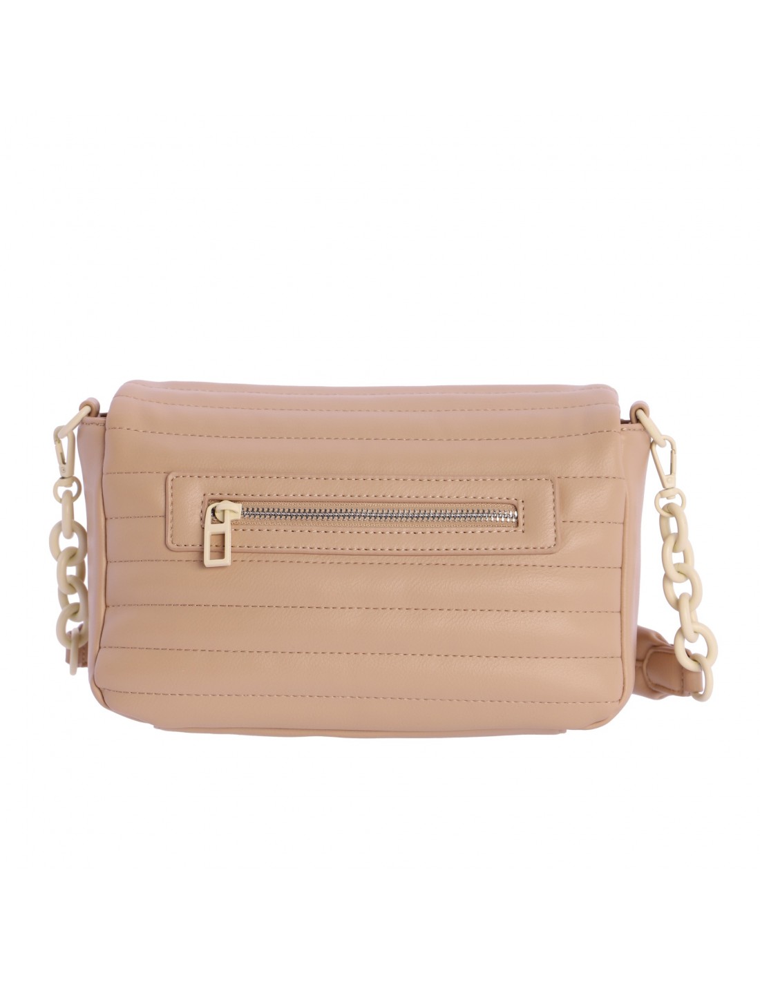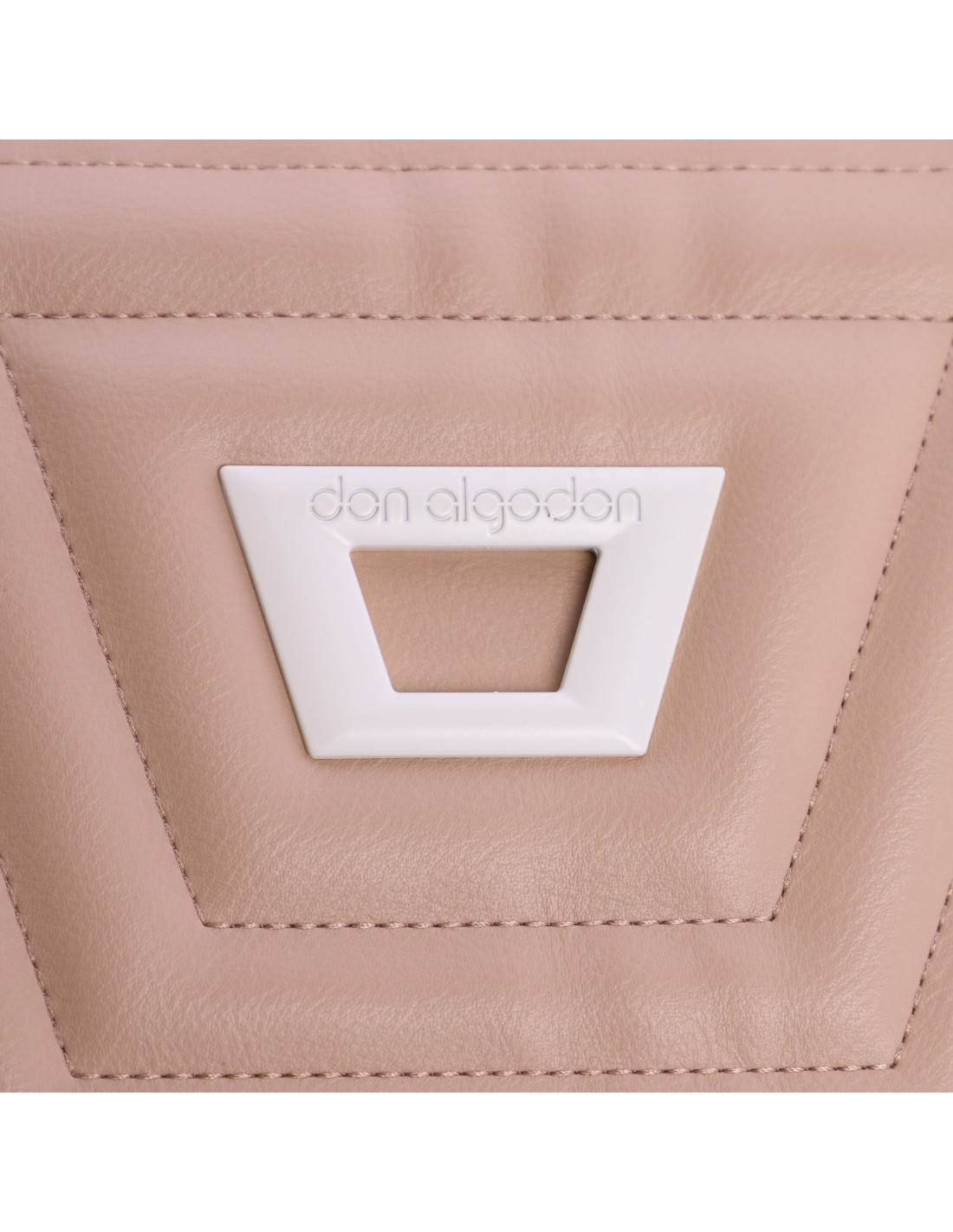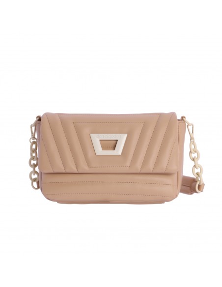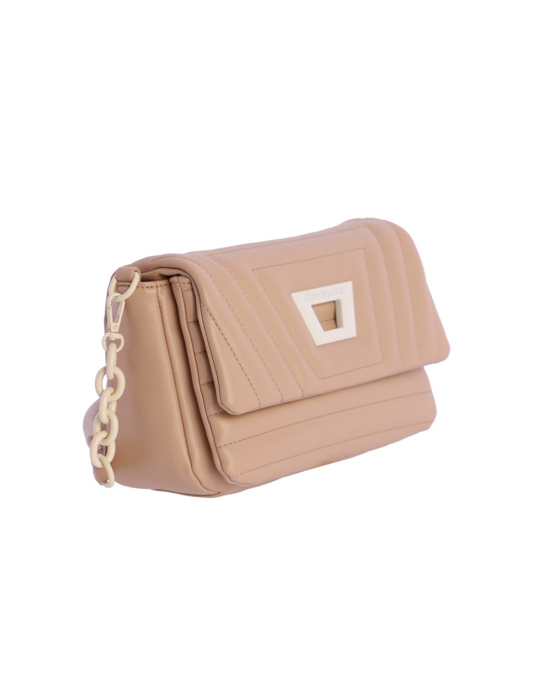 El bolso don algodon es un bolso de solapa confeccionado en PU acolchada color beige con detalles como apliques, cadena y logotipo metálico en color blanco.