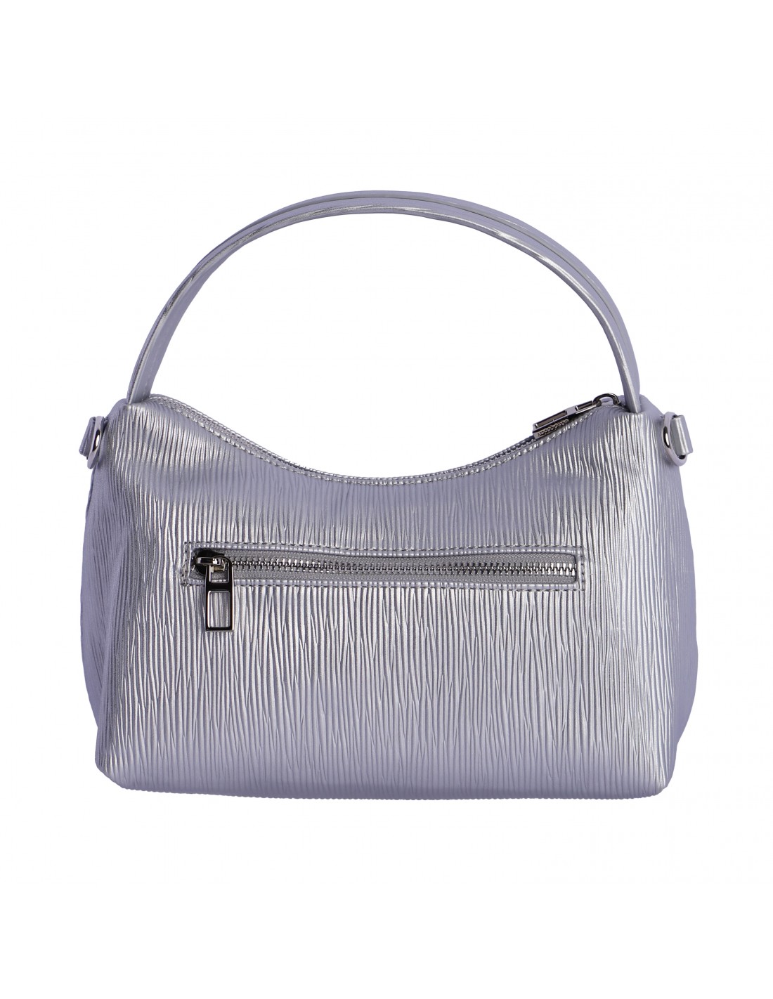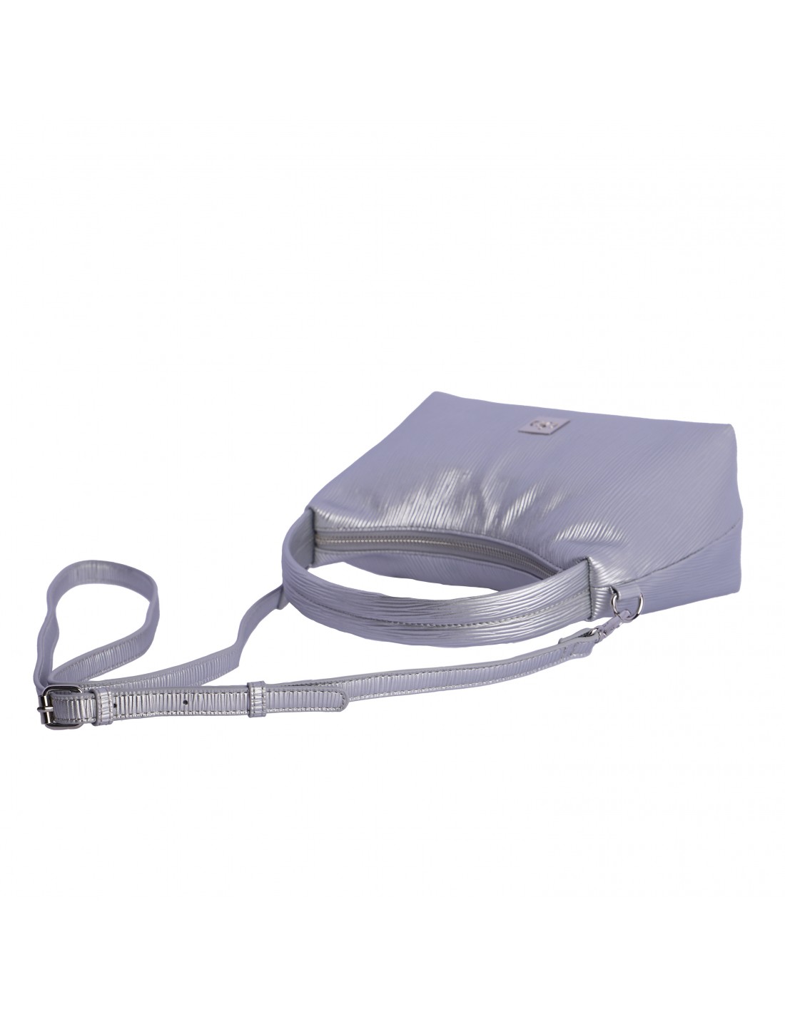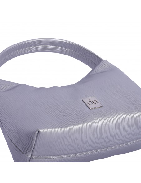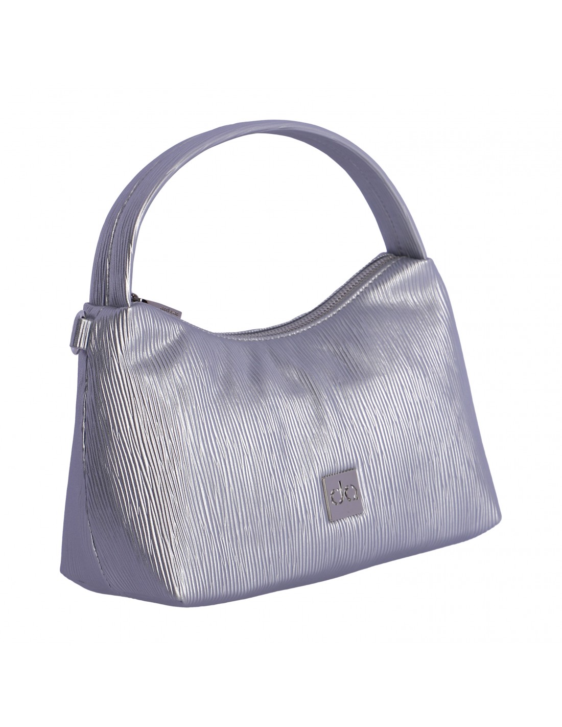 Confeccionada en PU plateado, la bandolera don algodon con asa de mano presenta una superficie con textura estriada, logo metálico en el frontal, apliques plateados y cursor logotipado.