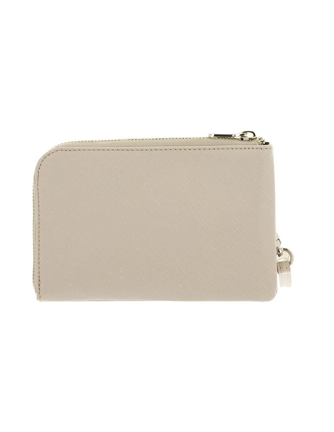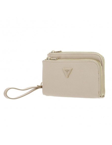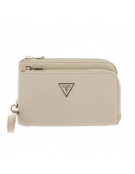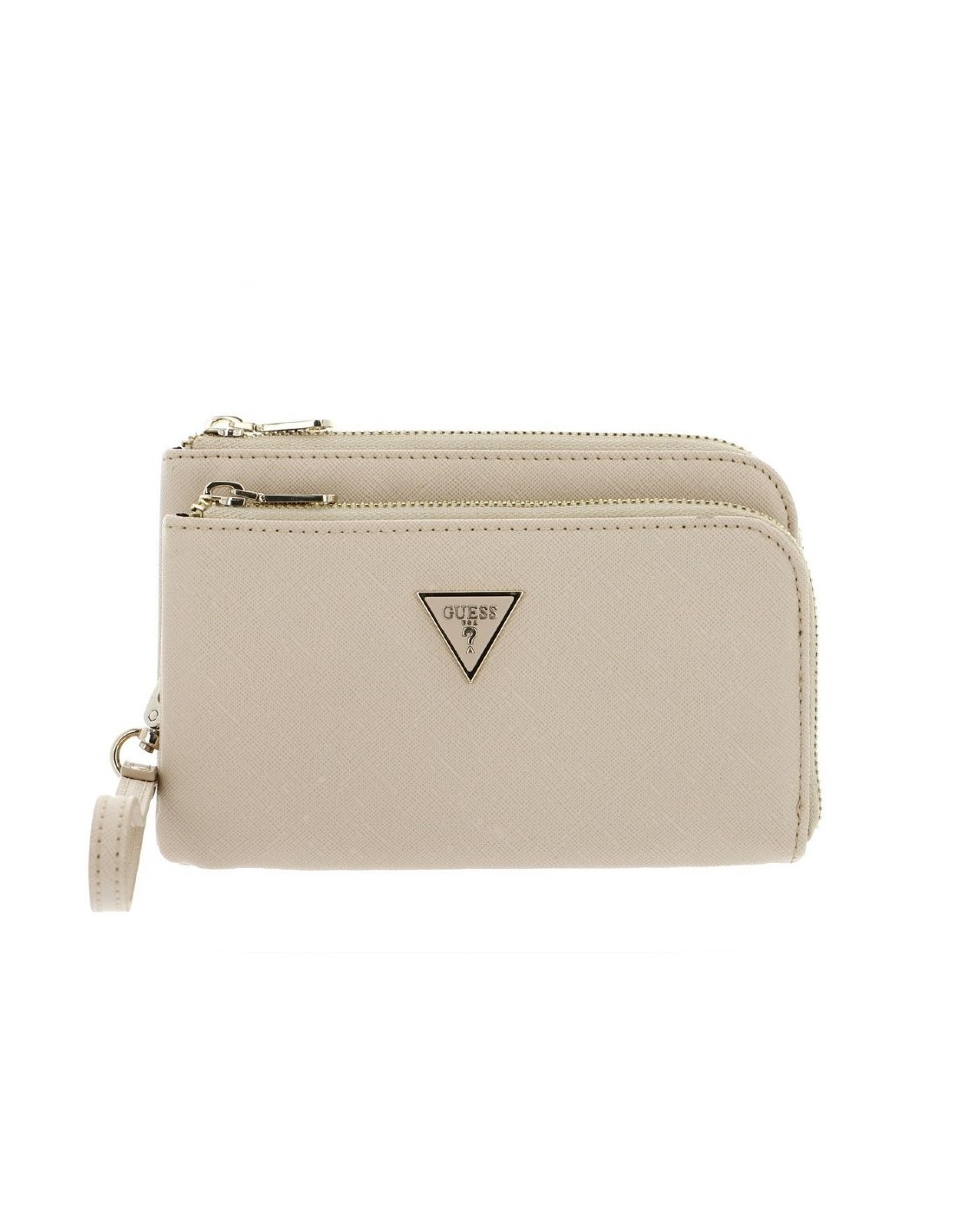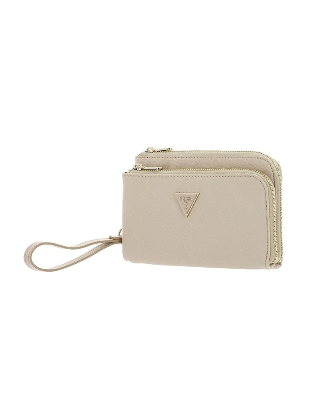 Confeccionado em material sintético cor rosa palo, a carteira Guess Pouch de mão apresenta uma superfície com efeito saffiano, ferragens douradas pálidas e logotipo triângulo metálico frontal.