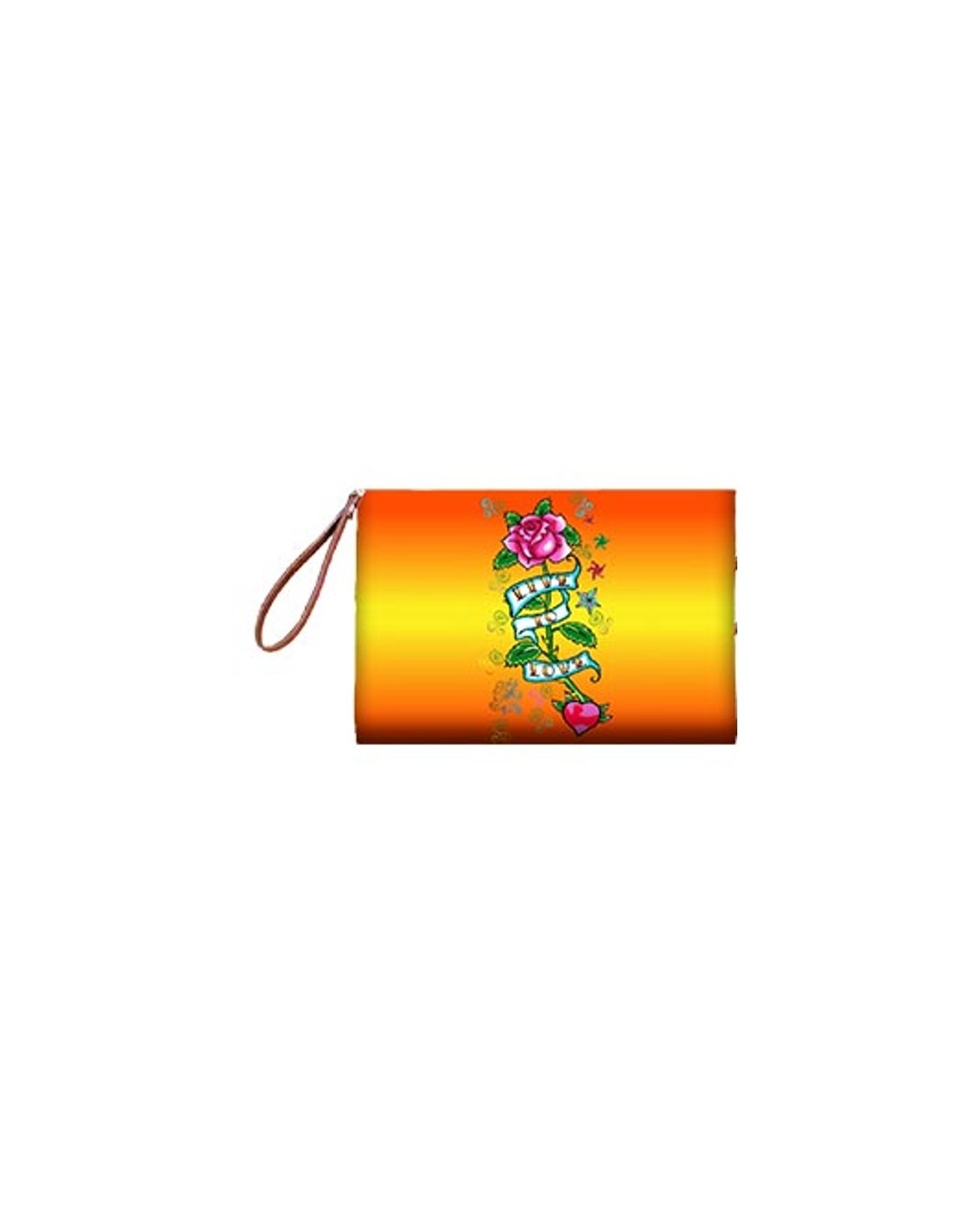 O bolso neceser Glöko apresenta um bonito fundo multicolorido com detalhe tipo tatuagem e legenda "Live to Love".